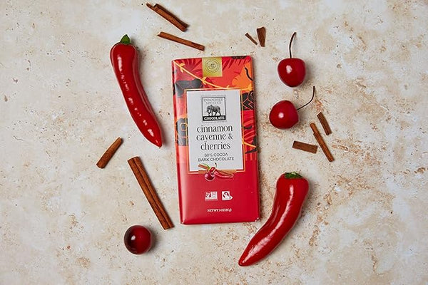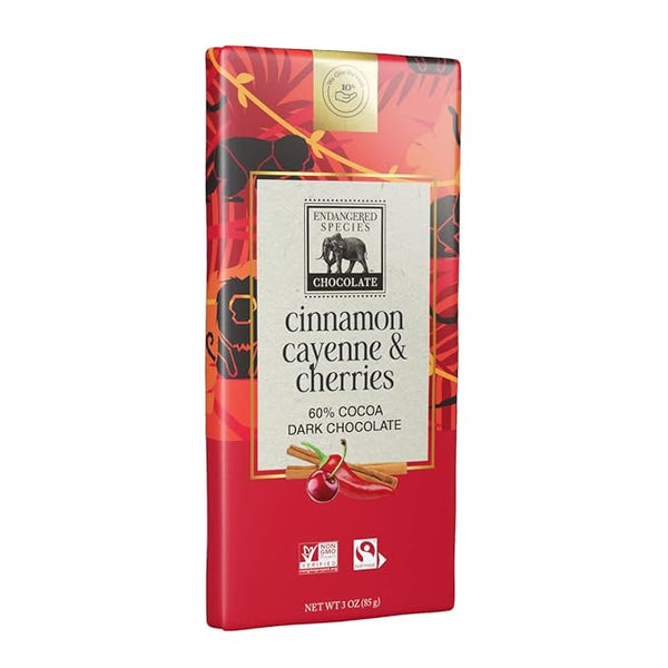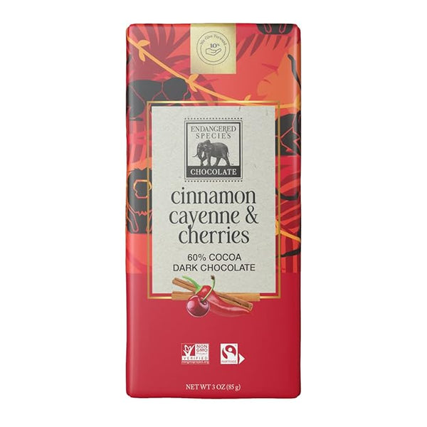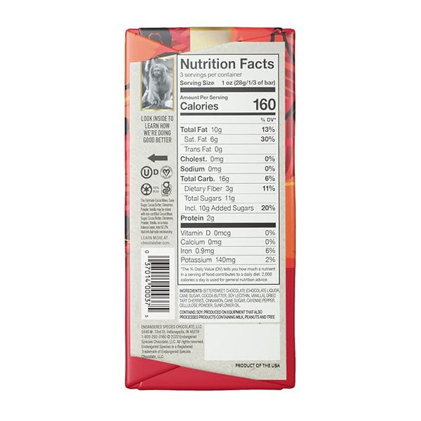 Product descriptionEndangered Species Chocolate Product LineCinnamon Cayenne CherriesCaramel & Sea SaltSalted PeanutsRaspberry FillingOrange