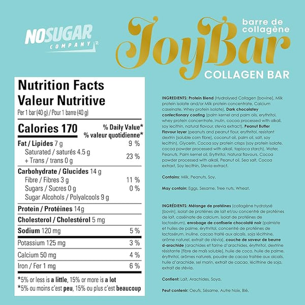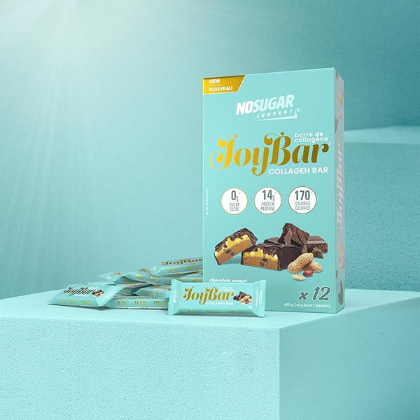 No Sugar Joybar Collagen Bar - Chocolate Peanut Butter - 0g Sugar 14g Protein - Nourish Inside & Out - Low Calorie High Protein Snack - Supports Skin Hair Nails & Joint Health - 12 Pack