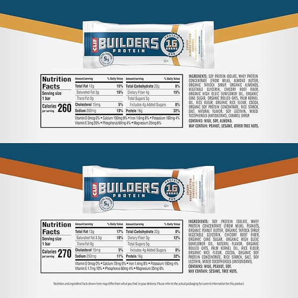 CLIF BUILDERS Crispy Protein Bars are an excellent source of protein from whey, soy, and nuts. In a variety pack containing two 6-pack boxes with Crispy Almond Salted Caramel and Crispy Peanut Butter Chocolate flavors, this crispy high protein bar with reduced sugar* tastes great and has 5 grams of sugar per bar. With 16 grams of protein per bar, these protein bars are made with real almonds or real peanut butter. These gluten free protein bars contain no artificial sweeteners, which makes for tasty protein snacks to help power your active day. *60% less sugar than original CLIF BUILDERS bars
