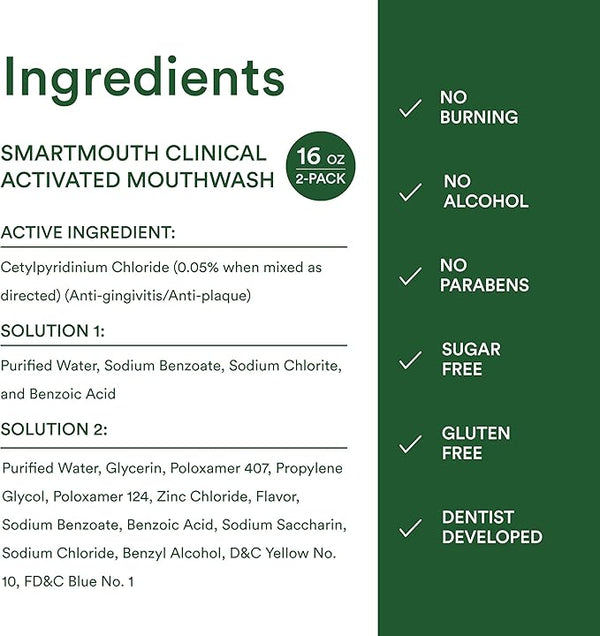 Product descriptionOur mouthwash eliminates odors and prevents their return for 24 hours with just two uses daily.Our premium Zinc Ion Toothpaste fights plaque, whitens, and protects enamel with no aftertaste.SmartMouth...