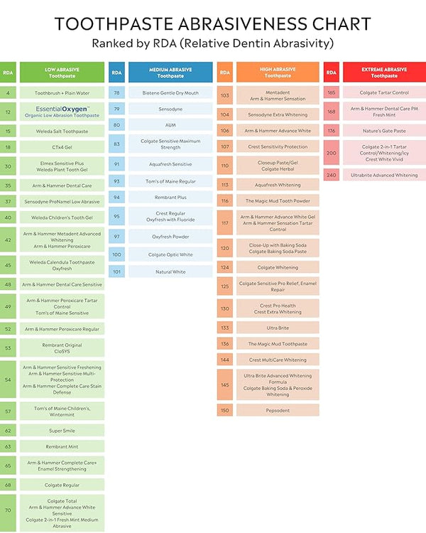 Essential Oxygen believes that the lowest RDA toothpaste is the enamel friendly choice for daily use especially if you are brushing 2 to 3 times a day. To remove surface film, stains and tartar without stressing your enamel, it¡¯s important to customize your level of abrasion. If you have thin enamel or tooth sensitivity, sprinkling BR On-Demand Tooth Polish on your toothpaste 3 times a week might be just right for you. If you build tartar quickly or consume staining foods like wine, coffee, tea or even green smoothies, you might use BR On-Demand Tooth Polish 7 times-a-week.