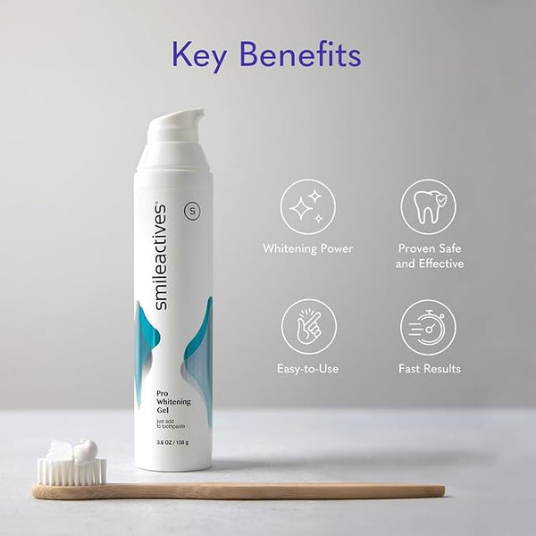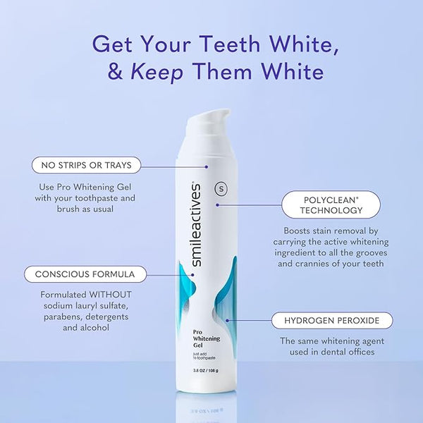 Remove stains and whiten your teeth while you brush. The gel penetrates the enamel pores to help lift and remove stains. Experience a long-lasting whiter smile when using gel as directed. You can always count on a whiter smile when using Smileactives! Easy, convenient, and essential for great dental hygiene, the Smileactives Power Whitening Gel works with your favorite toothpaste to deliver vibrant whitening. Get a whitening experience without a trip to the dentist or the professional cost associated. The gel has been clinically shown to whiten teeth an average of 6 shades in 30 days (when referencing shade guides commonly used by dentists) and preliminary results of a brighter & whiter smile can be seen in as little as 7 days.
