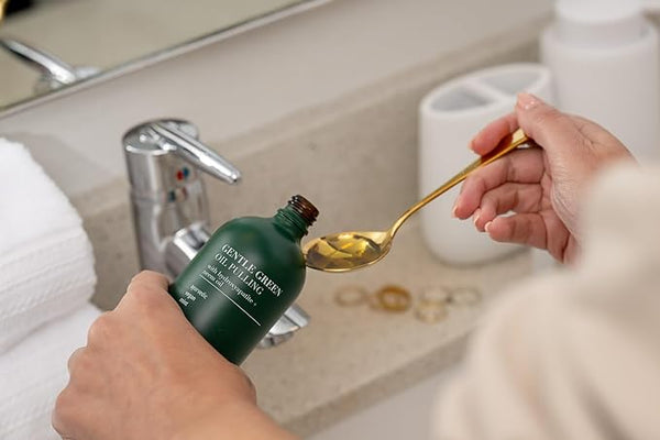 Gentle Green Oil Pulling is made in the USA and comes in a pharmaceutical-grade glass bottle to preserve freshness and block UV and UVB rays that can damage the oil.