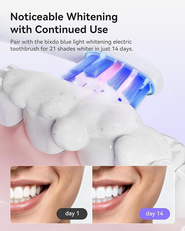 With regular use of the toothpaste alone, you can expect up to 11 shades whiter in 28 days. For faster and more noticeable results, pair it with the bixdo blue light electric toothbrush, which can help achieve up to 21 shades whiter in just 14 days.