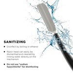 The razor can be disinfected by either boiling or using ethanol. The razor head can easily be dismantled and cleaned from the inside by rinsing water directly on the mechanism. Do not use "sodium hypochlorite" for disinfecting. Recommended for professional beauty and barber use only.