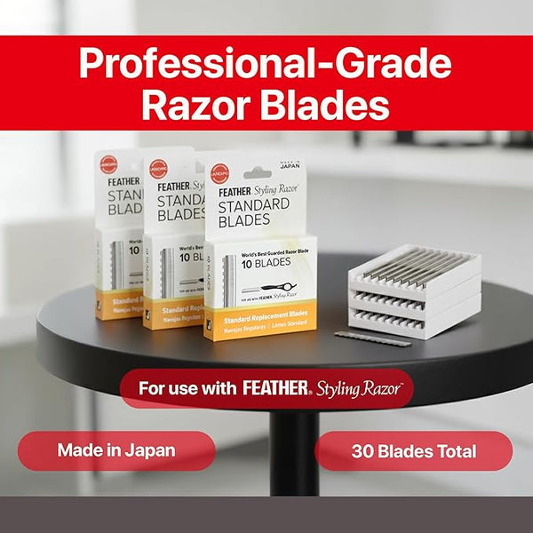 Feather Styling Razor Replacement Blades are engineered for barbers and stylists who demand accuracy and consistency. Each blades fits securely into your Feather styling Razor, delivering smooth and clean cuts. The safety guards helps prevent slipping while keeping hair from clogging the blade.