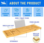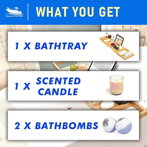 Our Bamboo bath tray table for tub designed for your ultimate comfort, it's a complete home spa solution. This exquisite tray boasts a dedicated slot for your phone, a wine glass holder, two removable spa trays, and a tablet and book holder. Plus, it includes bath Bombs and Scented Candles to enlighten things.