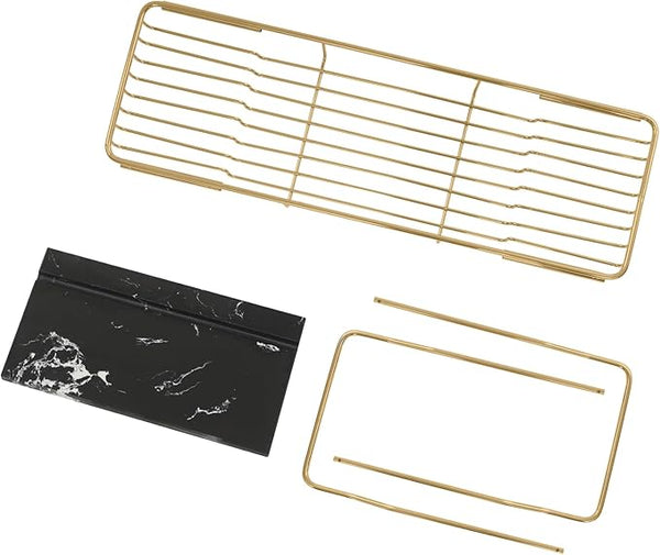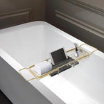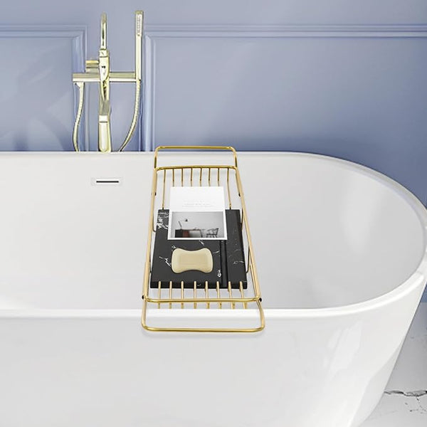 Bathtub Tray for Tub, Metal Expandable Extra Wide Bath Caddy Tray for Bathtub with Natural Marble Groove for Bath Spa (Gold Frame Black Marble Base)