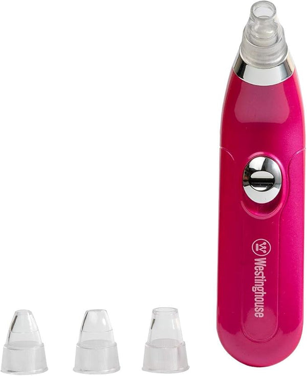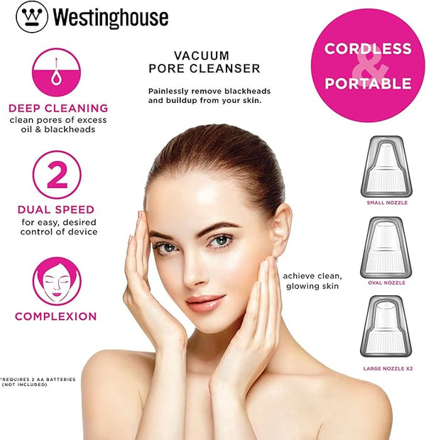 The Westinghouse Vacuum Pore Cleanser helps you to say "Goodby to Squeezing and Painful Extractions" by deep cleaning your pores of excess oil and blackheads. It features 3 interchangeable nozzles with different benefits. The Pore Cleanser has dual speeds for easy desired control of the device. Your skin will "Thank You" by revealing Clean, Glowing Skin.