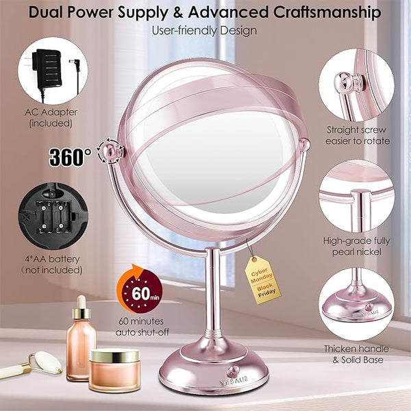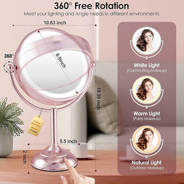 Product descriptionVESAUR 8.5" Rose Gold Lighted Makeup Mirror with 90 LED,Make U More CharmingVesaur Makeup mirrorExtremely Classy HD Distortionless 1X/10X Double-Sided Magnifying MirrorVintage Vanity Mirror with 3 Eye-Protecting Lighting ModesSplendid...