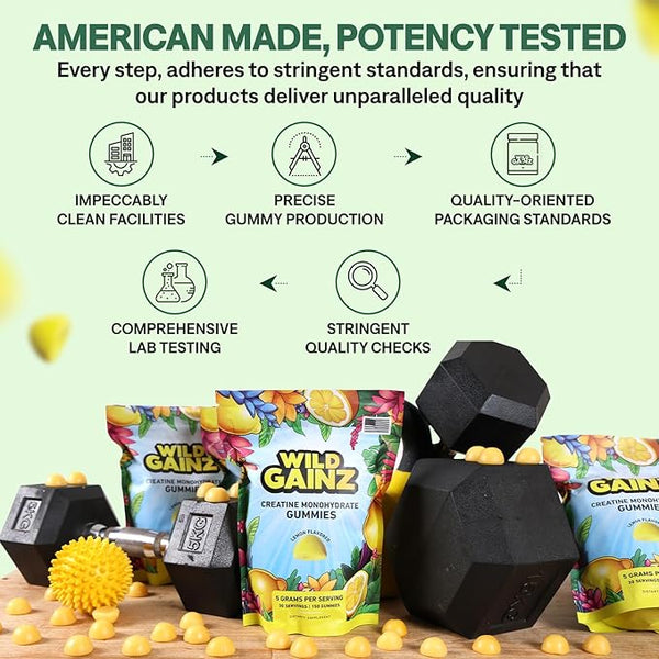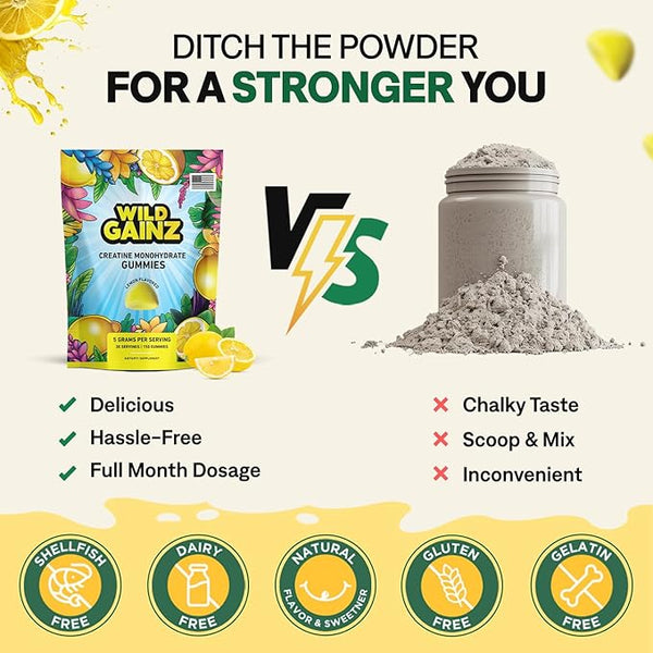 Wild Gainz Creatine Monohydrate Gummies support your muscle cells, especially during intense training. Creatine helps muscles produce energy so you can lift heavier, train harder, and build strength more efficiently.