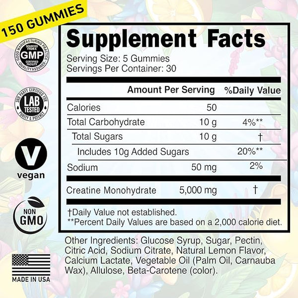 Each gummy contains 1g of creatine monohydrate. A full daily dose is 3?5 gummies, depending on your body weight.