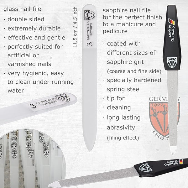 3 Swords Germany nail clippers are characterized by high-quality workmanship and excellent handling. The high cutting quality ensures a safe and clean cut. The set includes both fingernail and toenail clippers.
