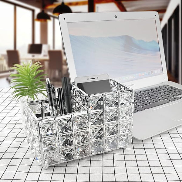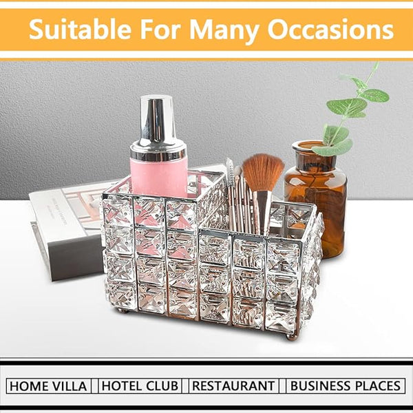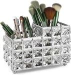 LUEXBOX Crystal Makeup Brush Holder One-Piece Square Brush Organizer Cosmetics Brush Storage Container for Table Dresser Bathroom Bedroom Organization (Silver)