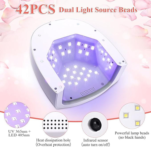 42 dual light source LED beads,UV 365nm + LED 405nm,Two types of light sources,fast and uniform curing,bidding farewell to"black hands".Heat dissipation holes with overheat protection,extends product service life,intelligent infrared sensing automatic switch,safe and convenient.