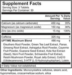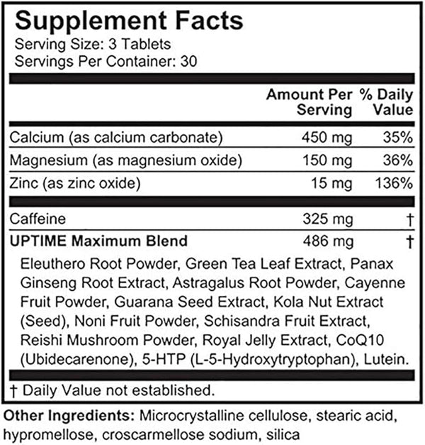 UPTIME Maximum Energy Tablets - Premium Blend - 325mg Natural Caffeine per Serving, Calcium, Magnesium, Zinc, CoQ10, 5-HTP, Zero Calories