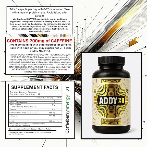 ADDY XR - Adderall Alternative - Luxury Energy Management - Focus & Energy Supplement - High End Brain Booster - Focus, Energy, and Memory Support Vitamins - 60 Day Supply
