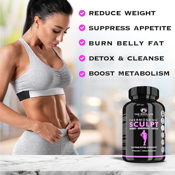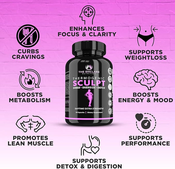 Not just another pack of diet pills that work fast for women but a natural fat burner for men and women designed to support burning fat as fuel while maintaining lean muscle, boosting energy, improving your mood, and supporting your brain and heart! Diet pills for women and men that help you feel less hungry, shred your unwanted weight, and keep you alert and focused. Enclare Thermogenic Sculpt delivers the mental focus, energy-boosting, and fat burning power you need to achieve your fitness goals.*