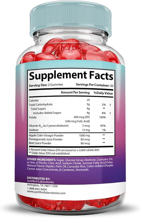 Our proprietary blend of apple cider vinegar gummies contain beet root, vitamin b12 and folate.