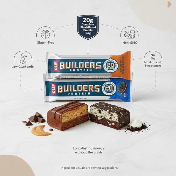 Builders Protein Bar Variety Pack, oreo and chocolate peanut butter 6 of each flavor 20g Plant Based Protein - Gluten Free - Non-GMO - Low Glycemic - No Artificial Sweeteners - 2.4 oz. (12 Pack)