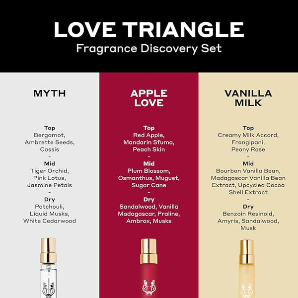 Use MYTH as a warm base for any scent combination. VANILLA MILK wears best if you let it settle into your skin for at least 10 seconds after applying. Layer APPLE LOVE with VANILLA MILK for a vibrant yet cozy scent for a sophisticated allure.