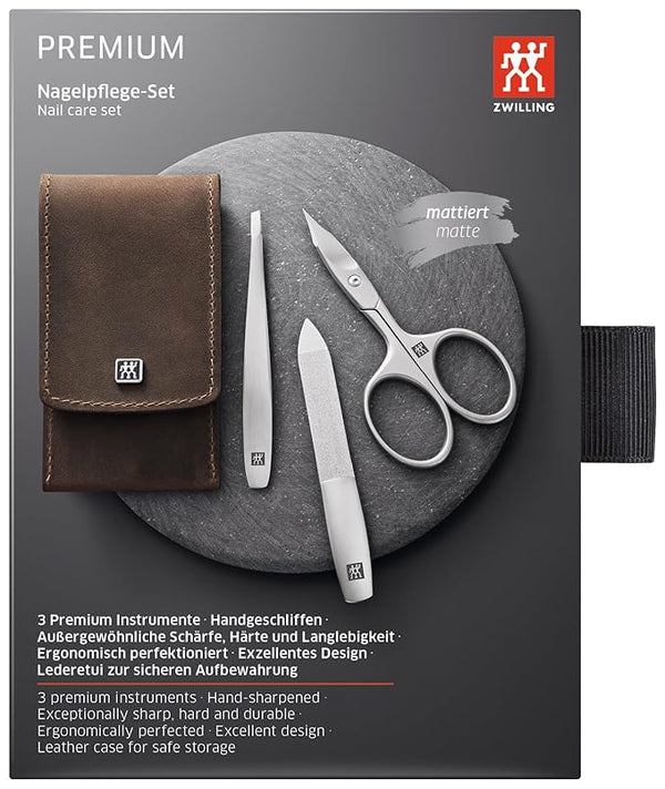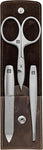 This professional 3-piece Premium nail care set is practical, space-saving and for both travelling and when out and about. The velvet interior of the attractive brown leather case with snap fastener securely holds nail and cuticle scissors, a sapphire nail file and slanted tweezers. The incredibly precise workmanship with satin-finished stainless steel and the perfect ergonomic design of the tools ensures outstanding longevity and functionality in an attractive design.