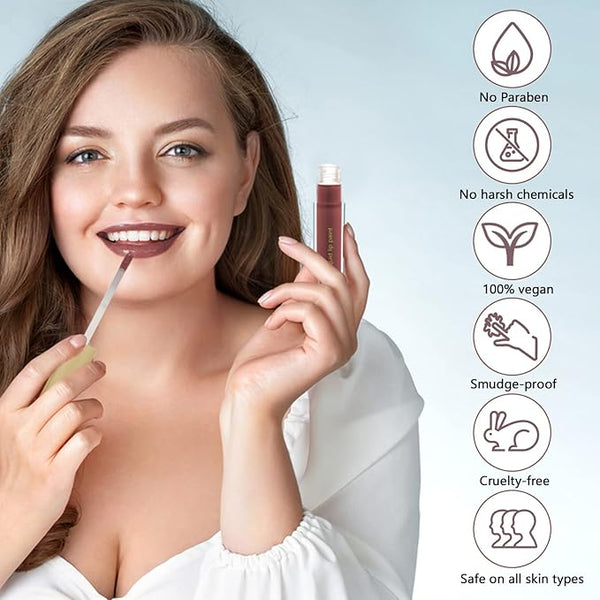 The silky smooth consistency of our lip paint glides on smoothly over your lips and delivers intense, rich and full coverage. It never settles into the lines and provides a flawless finish. The unique arrow tip of the applicator brush allows for precise and quick application.
