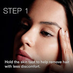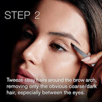 Tweeze stray hairs around the brow arch, removing only the obvious coarse/dark hair especially between the eyes.