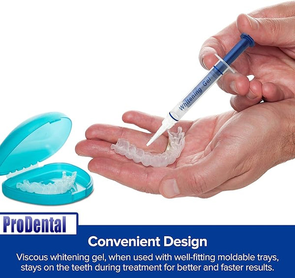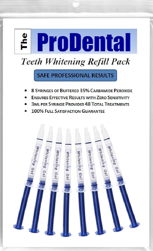 Our gel refill pack contains 8 x 3ml syringes with a total of 48 treatments (6 per syringe). For great results, the gel should be used with a moldable mouth tray (such as the ProDental Thin & Trim Dental Guard) and worn for 30 minutes per day. Recommended use is for 7-10 days or until your desired whitening results are achieved.