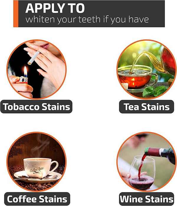 Strong Dental-grade 35% Carbamide Peroxide removes years of stains from coffee, wine, soda, tea, smoking. Whiter teeth can make you look 10 years younger, and also more attractive.