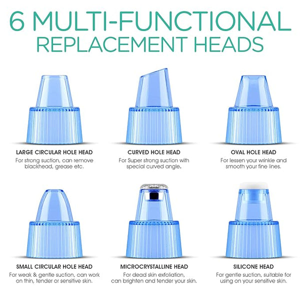 The blackheads remover is equipped with 6 multi-functional heads .You can choose a appropriate replacement head according to your needs and skin types, which will better help you effectively remove blackheads.