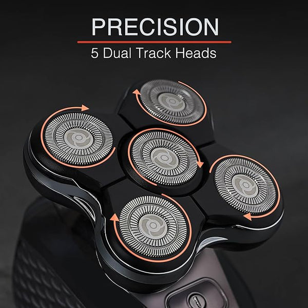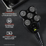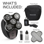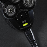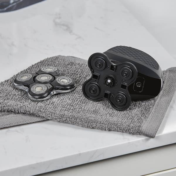 The electric razor shaver head is designed for multidirectional pivot, flex, and contour, delivering a close, smooth shave for your skull.