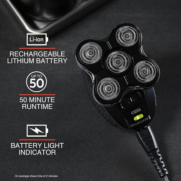 The REMINGTON Balder Pro Head Shaver features 5 Dual Track Heads, delivering 66% more cutting heads** for a close, comfortable shave. With Multidirectional Pivot, Flex & Contour, you get maximum skin contact on all sides of your head. Daily cleanup is easy thanks to the chamber below the shaver heads, which collects trimmed hairs as you shave. Plus, the shaver is 100% Waterproof for simple cleanup and versatile performance like shaving in the shower or with foam. The Lithium Rechargeable Battery delivers up to 50 minutes of runtime for reliable shaving and cordless convenience.
