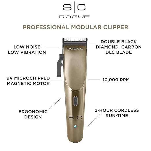 The Rogue clipper features a turbocharged linear magnetic motor with 10,000 strokes per minute and a Black Diamond Carbon DLC blade, offering superior speed, power, and longevity with whisper-quiet operation.
