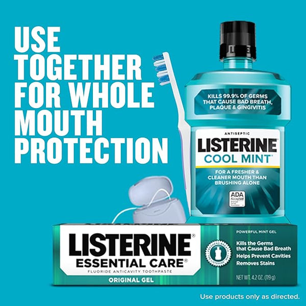 To get your whole mouth clean, try LISTERINE Essential Care Fluoride Anticavity Toothpaste in powerful mint gel. Not only does it kill the germs that cause bad breath, the fluoride formula helps prevent cavities, strengthens teeth and removes stains. Use product only as directed.