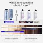 Blue: tone orange/brassy tones in brunette to dark blondes. Purple: tone yellow/brassy tones in medium-light blondes. Gold: revive sunny blondes, Red: revive red tones, Copper: revive copper/copper-red tones.