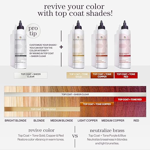 Use about 3 weeks after your color service when it begins to oxidize and you notice brassiness, or to revive warmer tones. You can use Top Coat every 6-8 shampoos, but we don¡¯t suggest using prior to this to prevent over-deposit of the color.