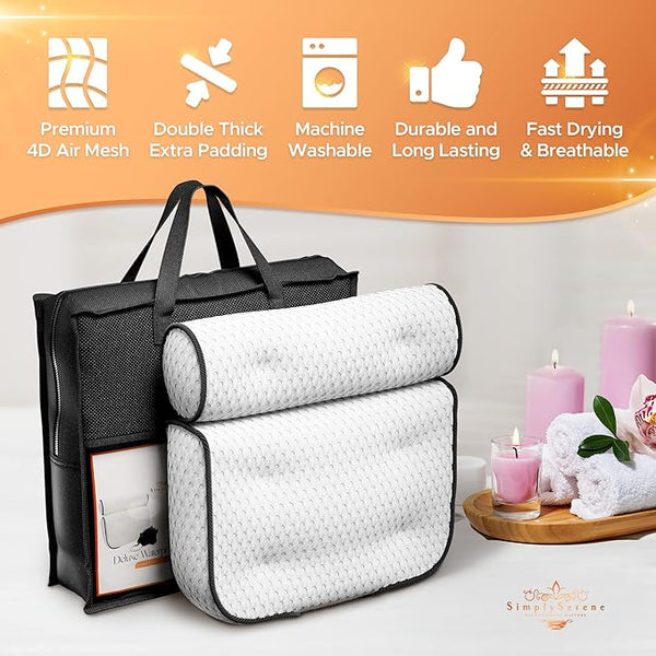 Experience ultimate relaxation with our bath pillow, featuring a plush, contoured design that provides support for your head, neck, shoulders, and back. Equipped with strong suction cups and fast-drying material, it's compatible with all tub types. Perfect for your self-care routine!