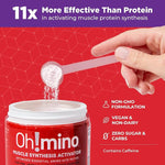 On a gram by gram basis, Oh!mino increases muscle synthesis in the body 11 times more than whey protein. It is also 20 times more effective muscle synthesis that BCAAs.