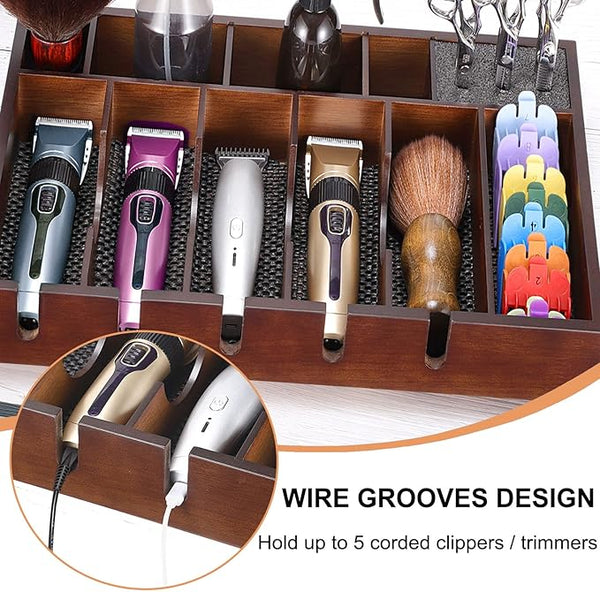Containing 5 clipper slots, 1 large and 6 small compartments, and 6 cubby hole for scissors, clips & combs.