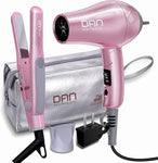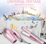 The travel bag holds the entire hairdryer, straightener and accessories. Small hair dryer with EU adapter for easy styling at home and abroad.