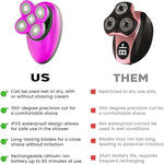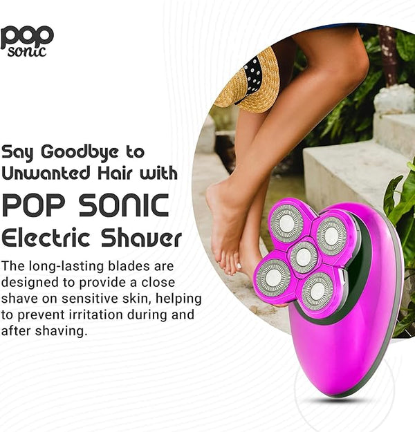 Introducing the 5-in-1 Pop Sonic Purple Electric Shaver for women. With 5 shaving heads, it offers wet or dry use, precise 360-degree cutting, and IPX5 waterproofing. Ergonomic design ensures comfort, while rechargeable Lithium-ion battery lasts up to 60 minutes. Easy maintenance with a pop-off head for cleaning. Enjoy smooth shaving on legs, arms, face, and bikini areas effortlessly!