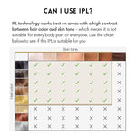 The My Sheen Skin IPL is suitable for a wide range of skin tones. IPL is least suitable on white, blonde and red hair as well as darkest skin tones. Please refer to the chart above.