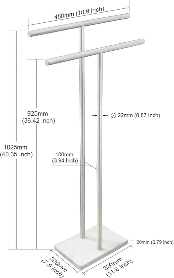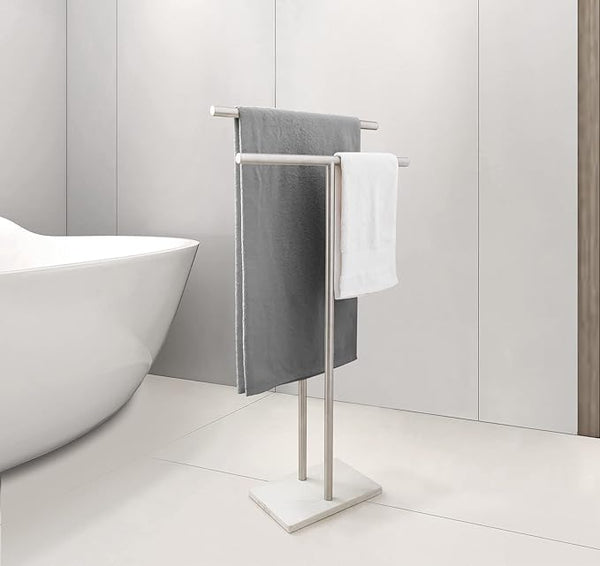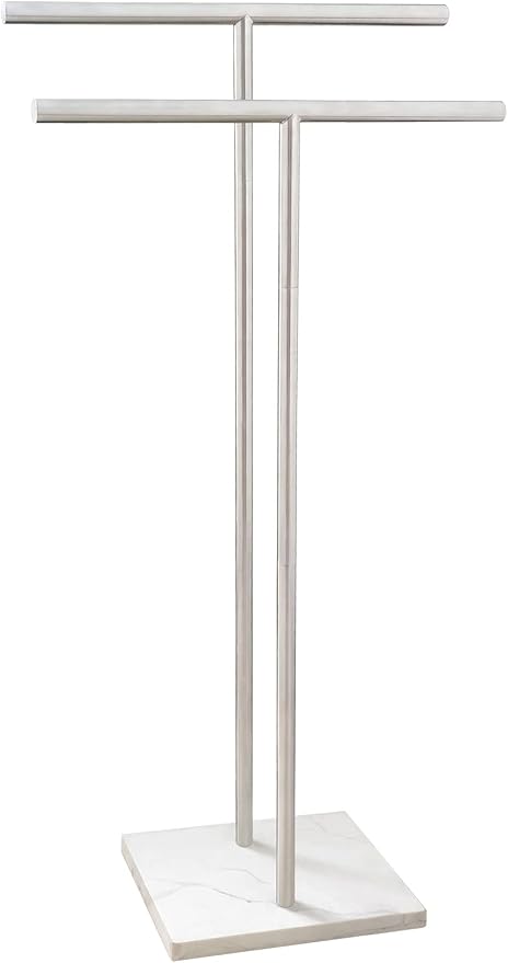40 Inch Standing Towel Rack Double-T Shape Tall Bath Towel Sheet Holder with Marble Design Base for Bathroom Floor Next to Tub or Shower 2 Tier Towel Holder Stand Stainless Steel Brushed Nickel