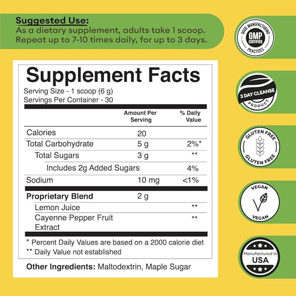 Lemon in the Master Cleanse powder infuses a tangy and revitalizing flavor. This essential ingredient supports detoxification and enhances overall well-being due to its high vitamin C content and alkalizing properties.
