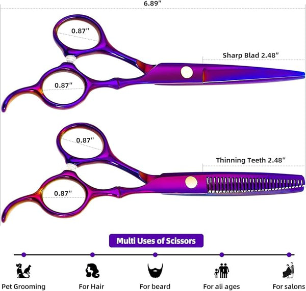 Product descriptionProfessional Hair Cutting Scissors SetsPerfect Ergonomic DesignTips: Our scissors are very sharp, be careful when you use them!Hand polished blade edge to make sure every inch of the blade...