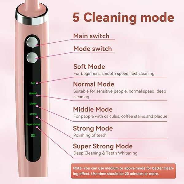 5 Cleaning Modes:Teeth cleaner has 5 modes, including soft, normal, middle, strong, super strong mode, corresponding to choose their own suitable mode to use, it is recommended to use medium or above mode for better cleaning effect.