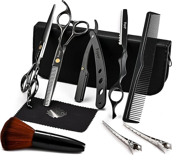 1 x Hair Scissors,1 x Thinning Shear,1 x Hair Texturizing Cutting Razor, 1 x Straight Edge Razor (Blade Included), 1 x Cleaning Cloth, 1 x Comb, 2 x Hairpin, 1 x Neck Duster Brush, 1 x Hair Scissors Screw Adjustment, 1 x Leather Bag. The hair cutting kit meets all your hair cutting and styling need.