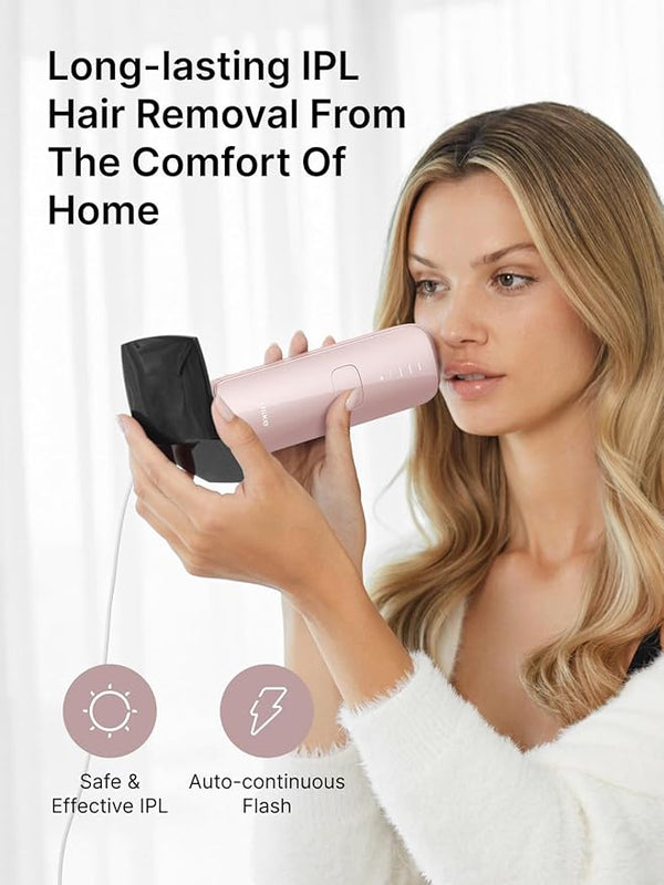 An at-home Intense Light Pulse (IPL) hair removal device that uses multiple wavelengths of light targets the melanin in the hair follicle, which breaks the cycle of hair regrowth. With continued use, it delivers long-lasting hair reduction results.