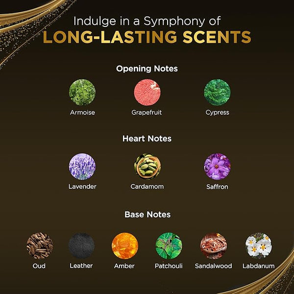 This Arabian perfume for men features zesty grapefruit, deep cardamom, & saffron, harmoniously infused with creamy sandalwood & oud, all set against a backdrop of exquisite & diverse woods. Discover a fragrance that's both complex & enviably alluring.